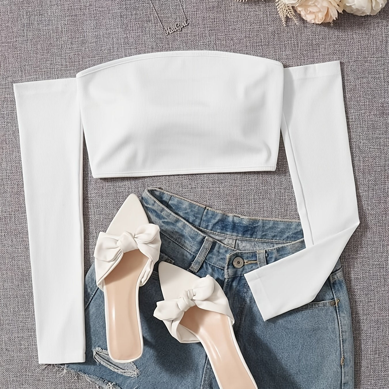 Women's Off-Shoulder Short Crop Top - Slim-Fit Sleeve Stretchy Shirt, Solid Black All-Season Versatile Top for Casual & Formal Outfits, Machine Washable Elegant Women's Fashion Apparel