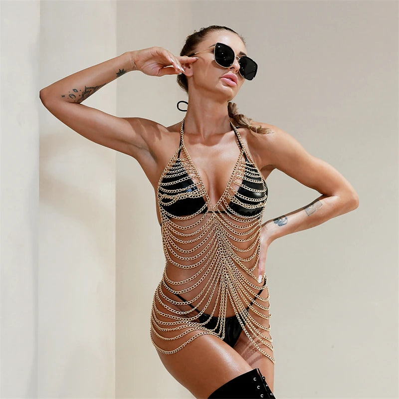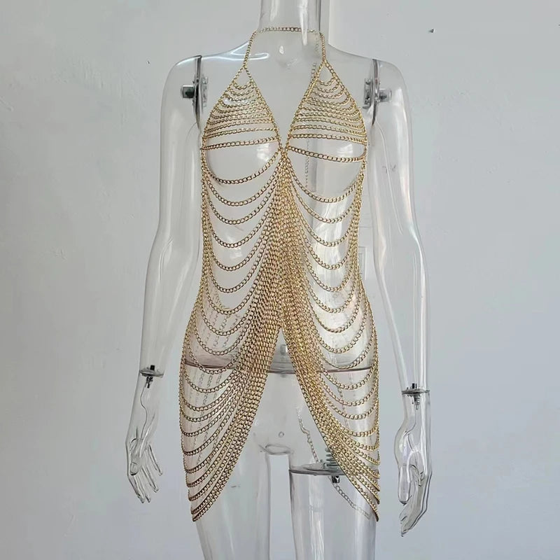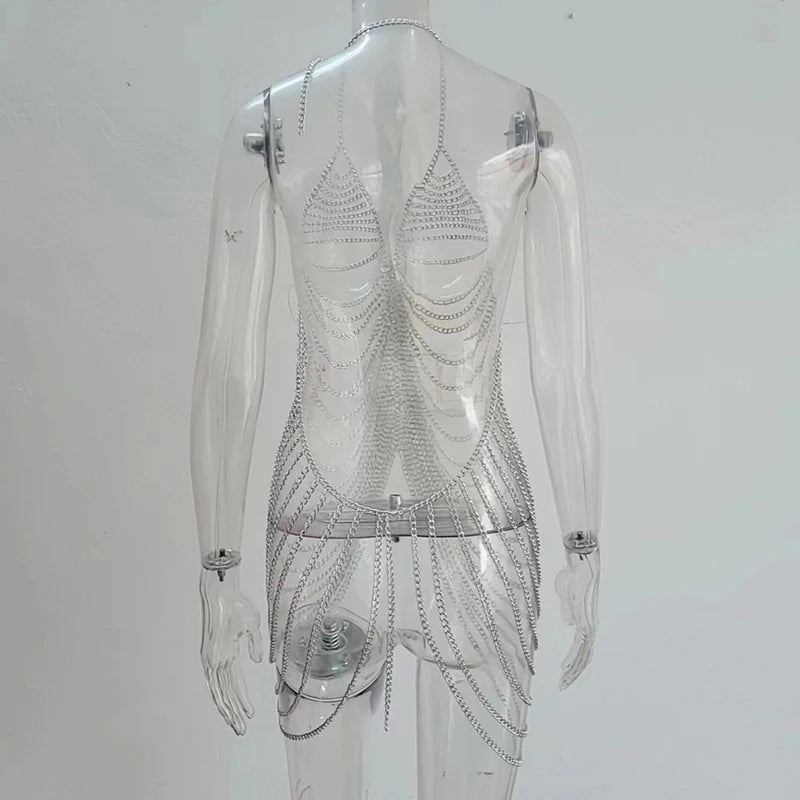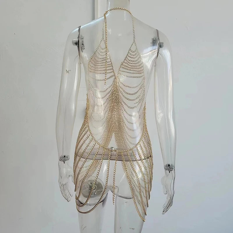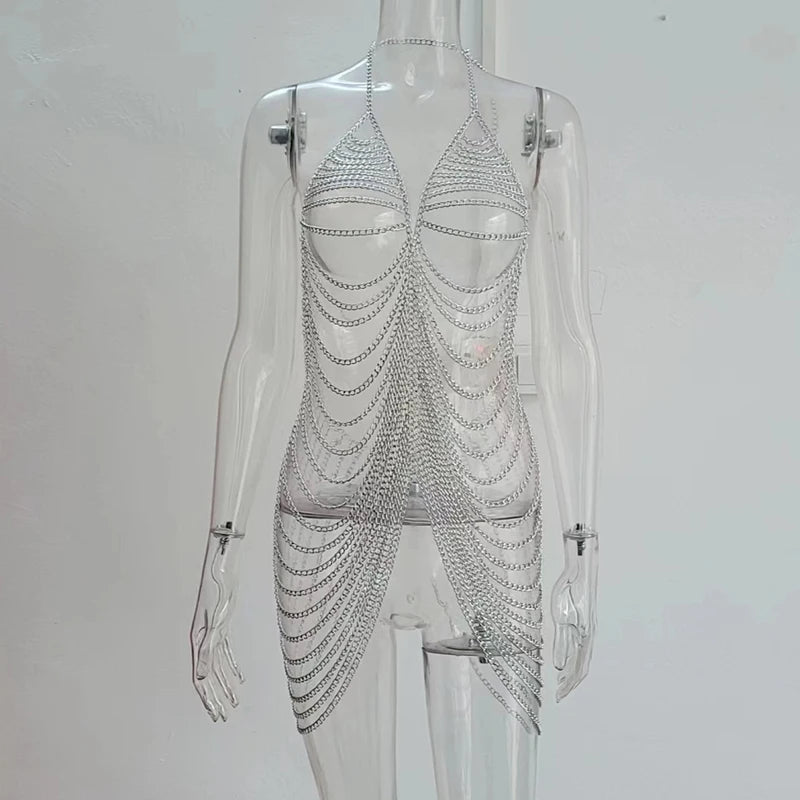 Women's Sexy See-through Mini Dress with Metal Chain Backless Design for Beach Club Party Summer Fashionable 2025