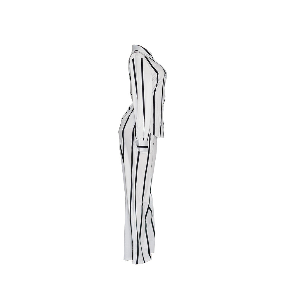 [Two-piece Set Long Sleeve Shirt] Striped Print Two-piece Set, Button Front Collar Long Sleeve Shirt & High Waist Wide Leg Loose Pants Set, Women's Clothing