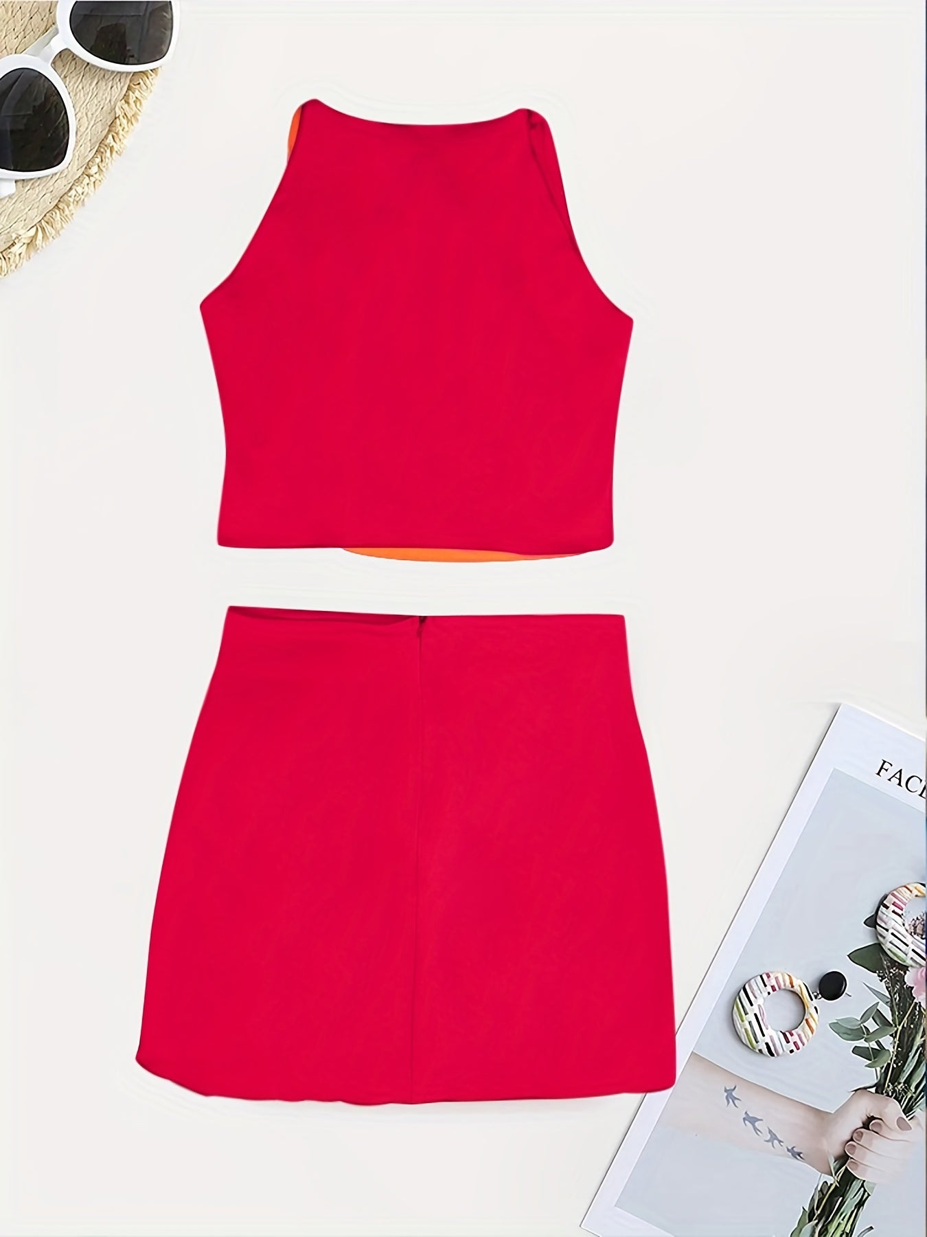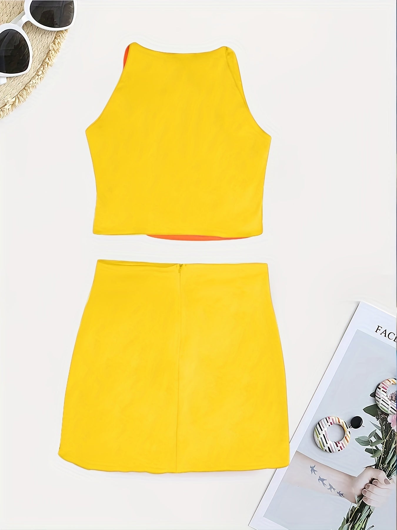 Beaded Color Block 2 Piece Set, Sexy Crop Halter Top & Asymmetrical High Waist Skirt, Women's Clothing