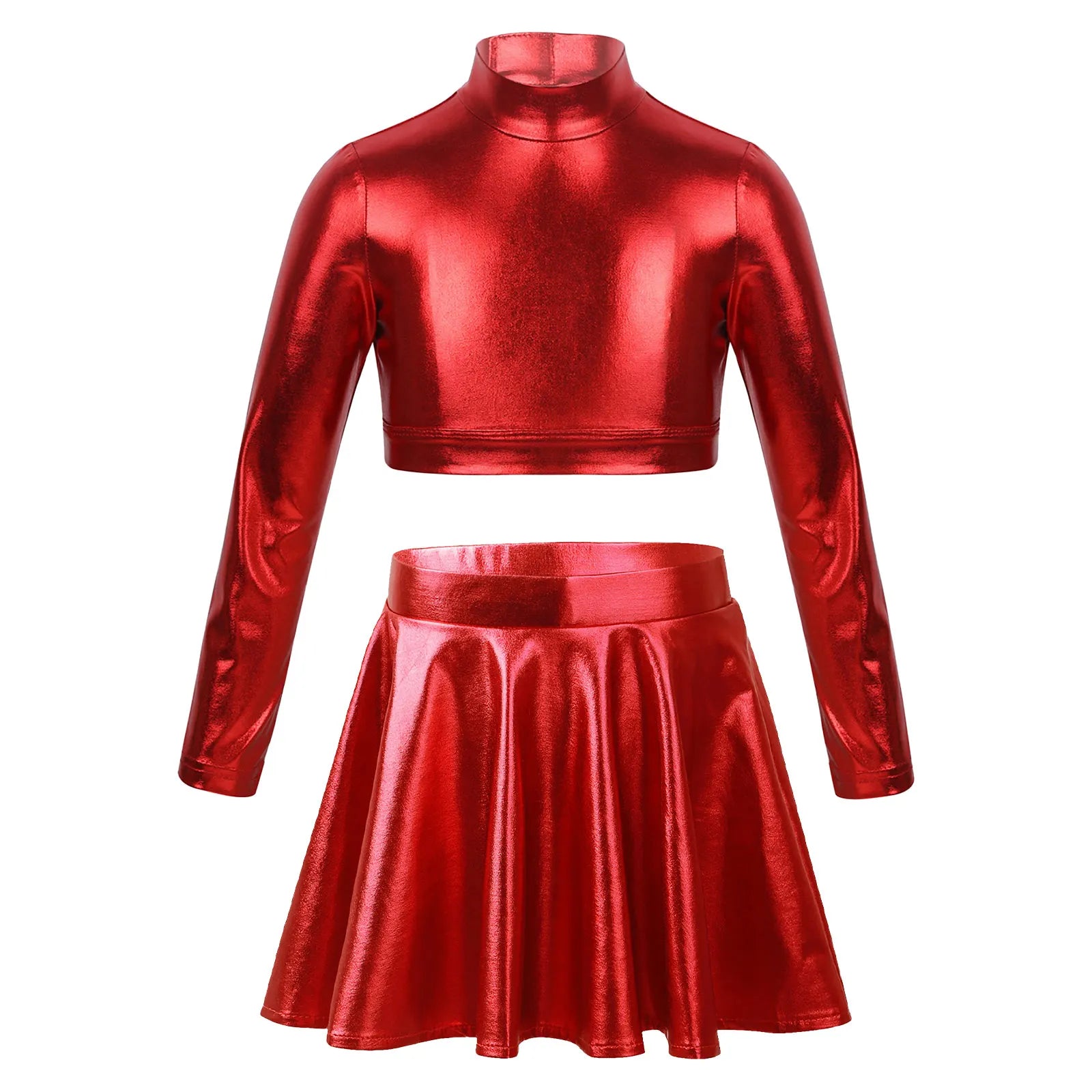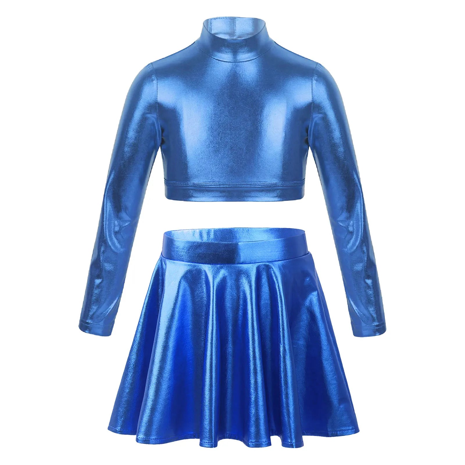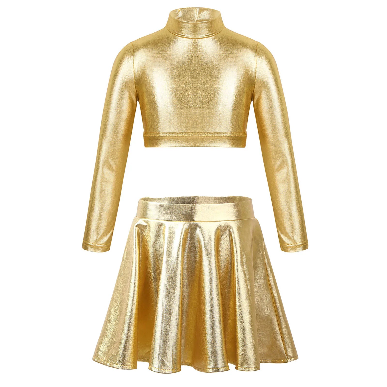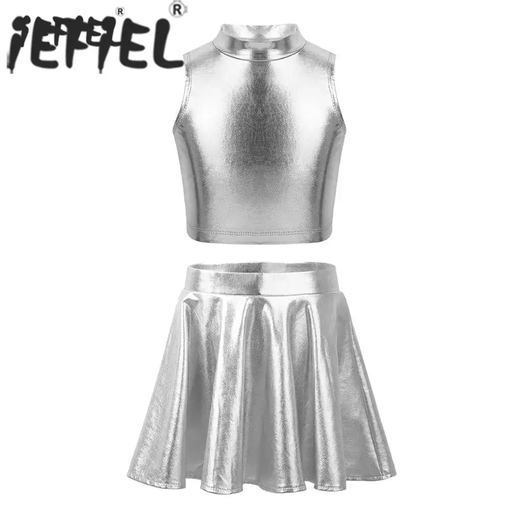 Children Clothing Girl Metallic Sleeveless Tops Flared Pleated A-Line Mini Short Skirt Kids Outfits 2pcs Clothes Set Dance Wear