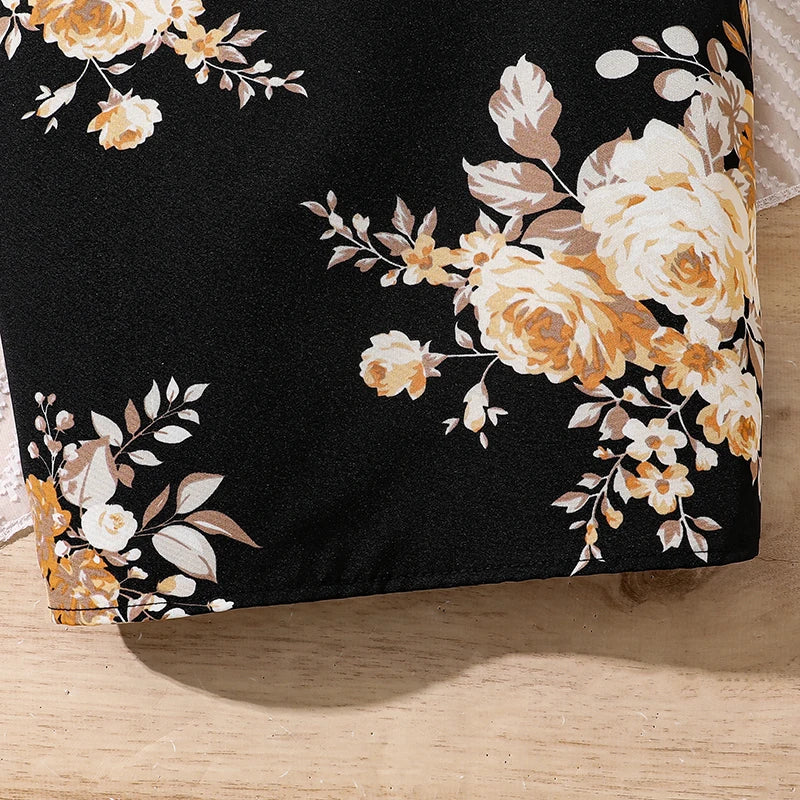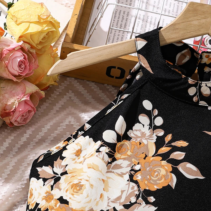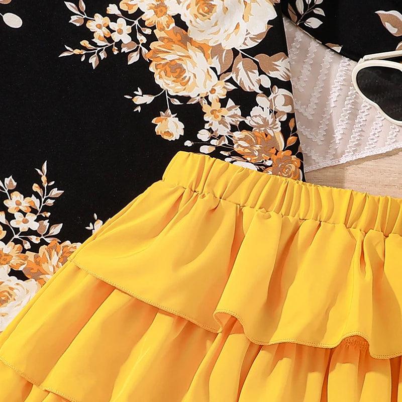 Children Clothes Girl Outfit Black Flowers Printed Vest & Yellow Tiered Skirt With Hats 3 Pcs Sets Stylish Girls Outfit