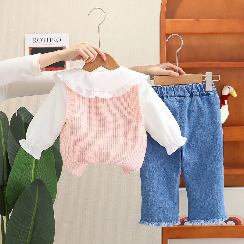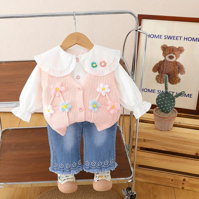 Children Clothing Sets for Girls T Shirt Floral Vest Bow Jeans Spring Autumn Toddler Baby Clothes Infant Outfits Kids Tracksuit
