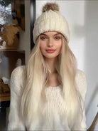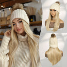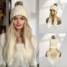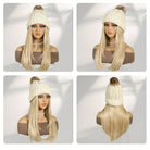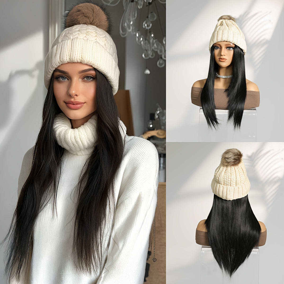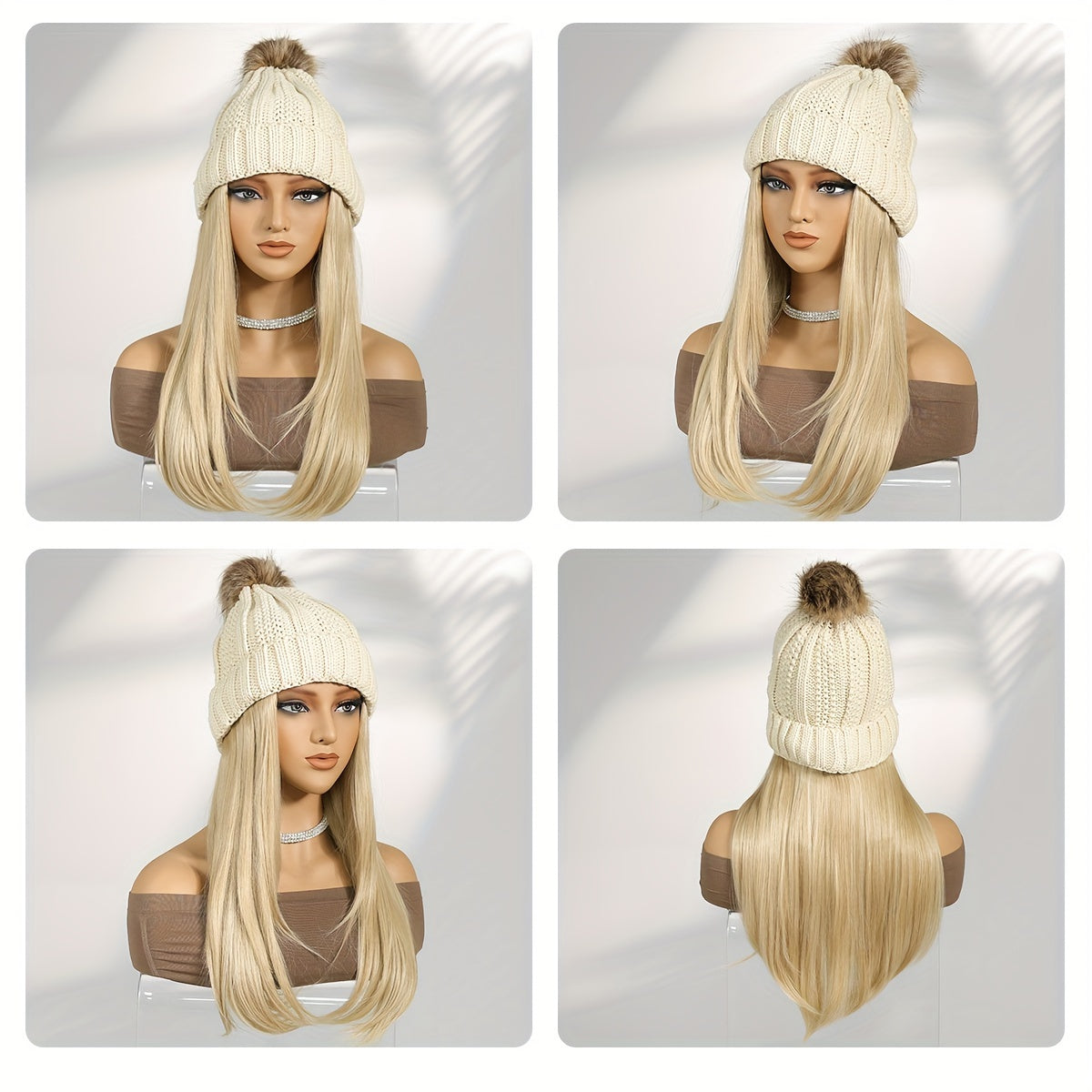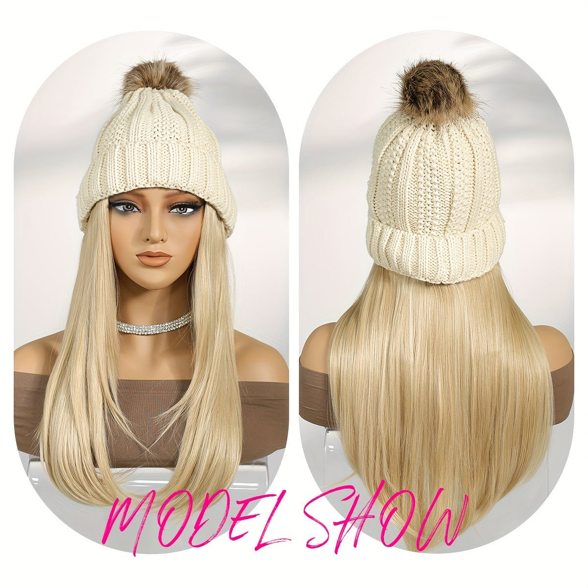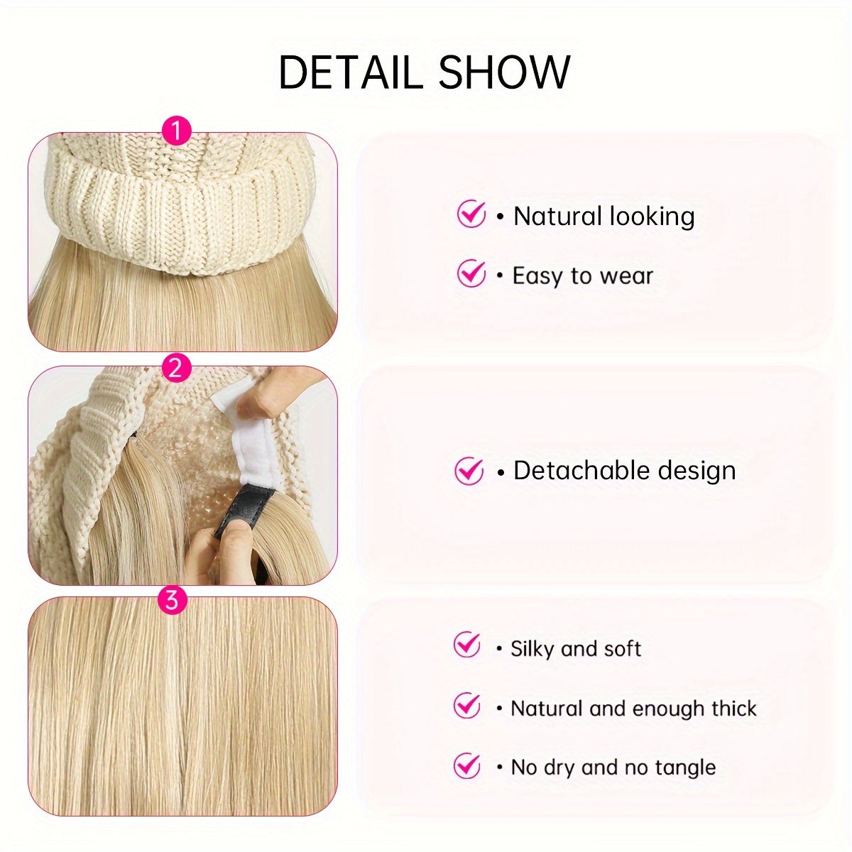 Detachable needle apricot yarn-dyed hat wig, winter thick hat 16 inches natural straight hair long hair wig cap heat resistant synthetic fiber adjustable size Women's high quality high weight no knots, natural smooth does not