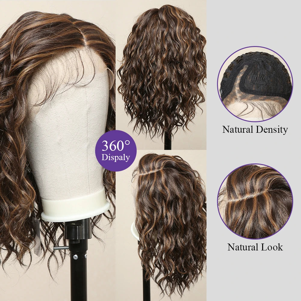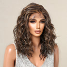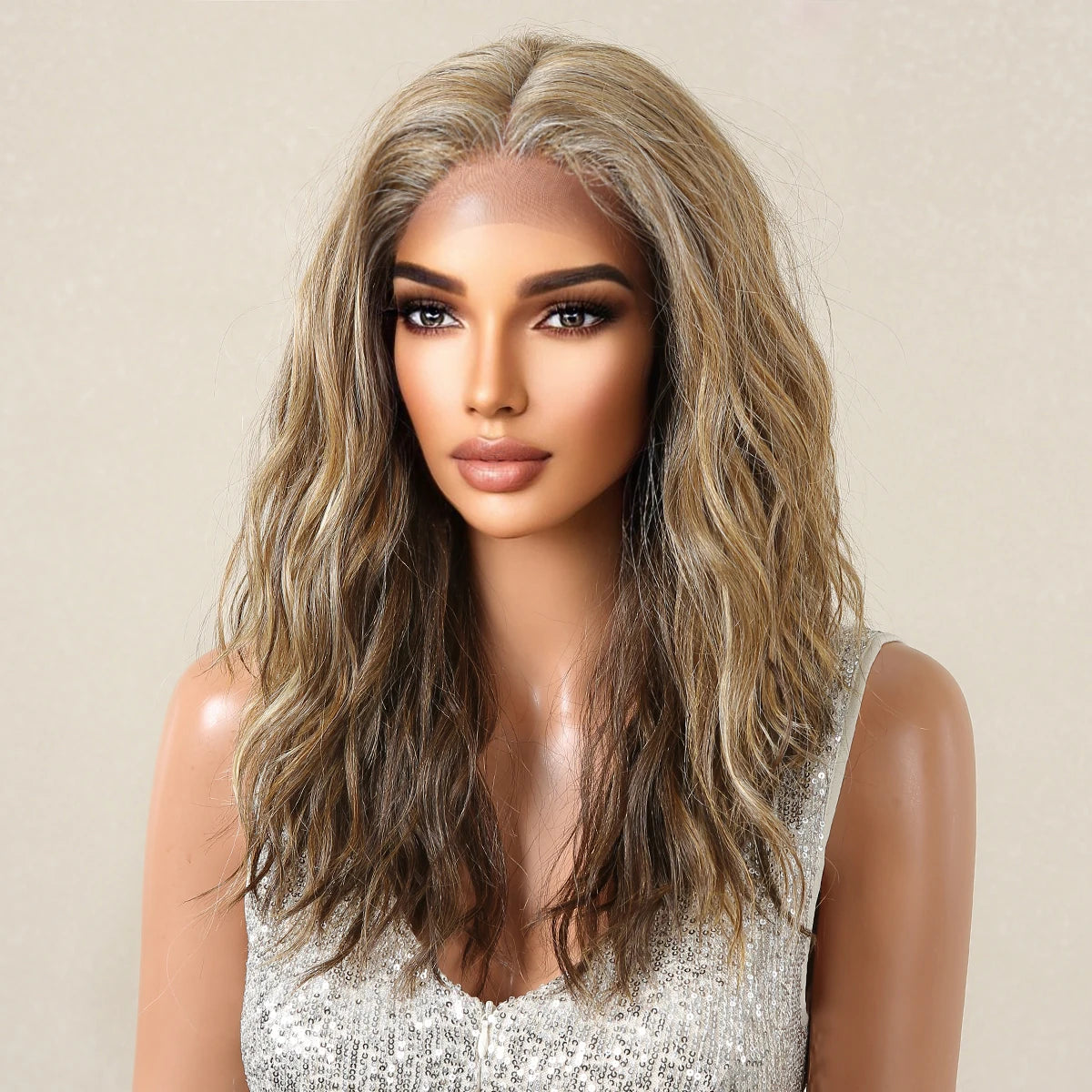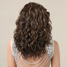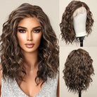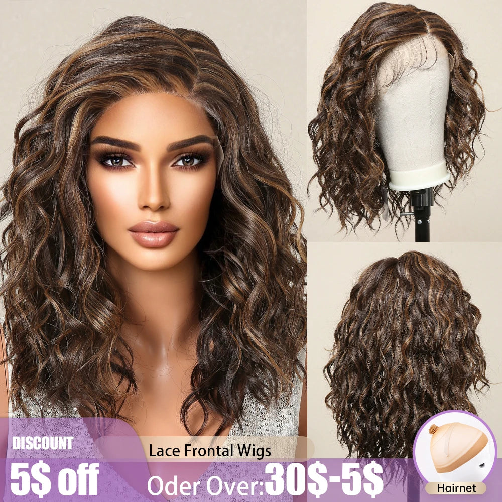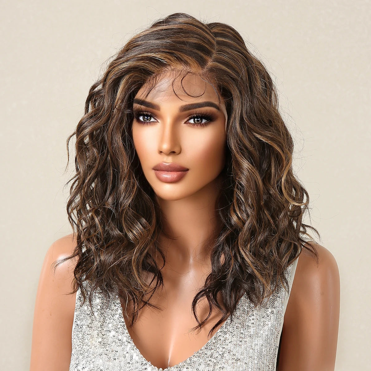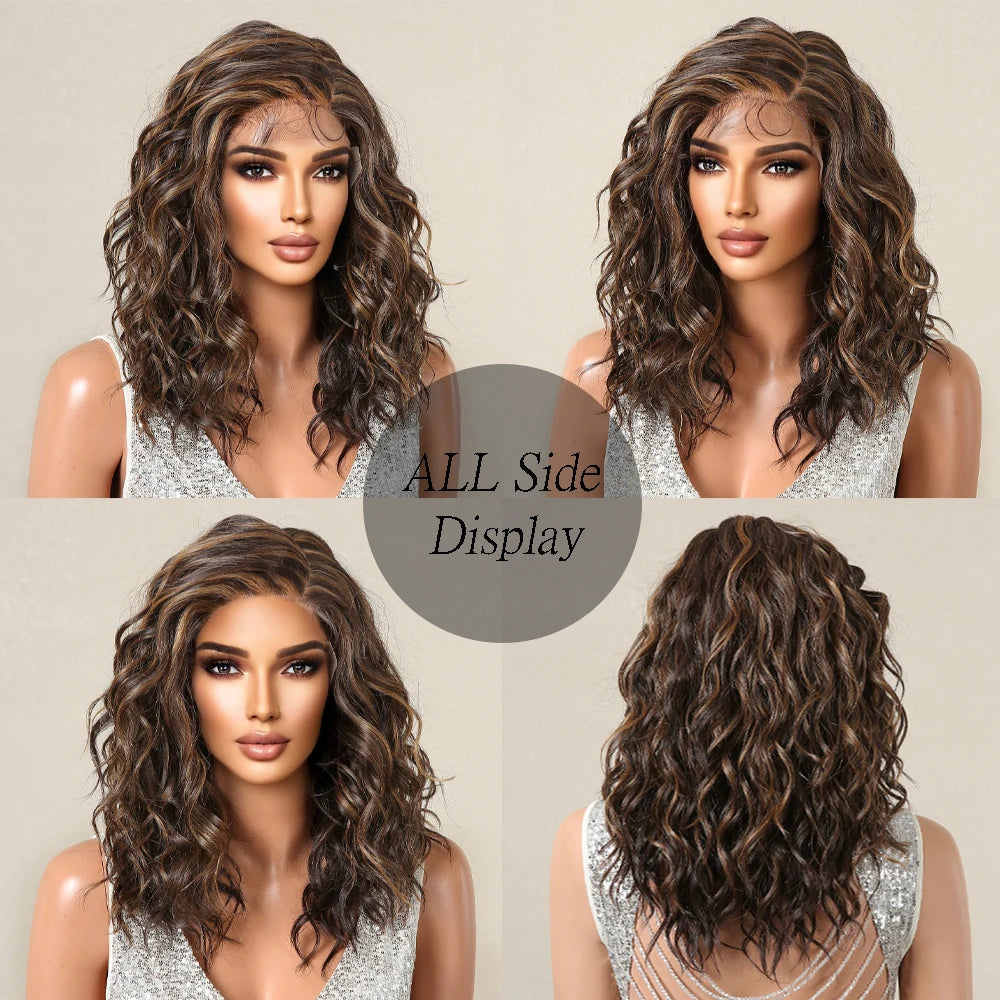 Elevate your style with this shoulder-length lace front wig—pre-plucked for a natural hairline, featuring curly waves in brown with golden highlights!