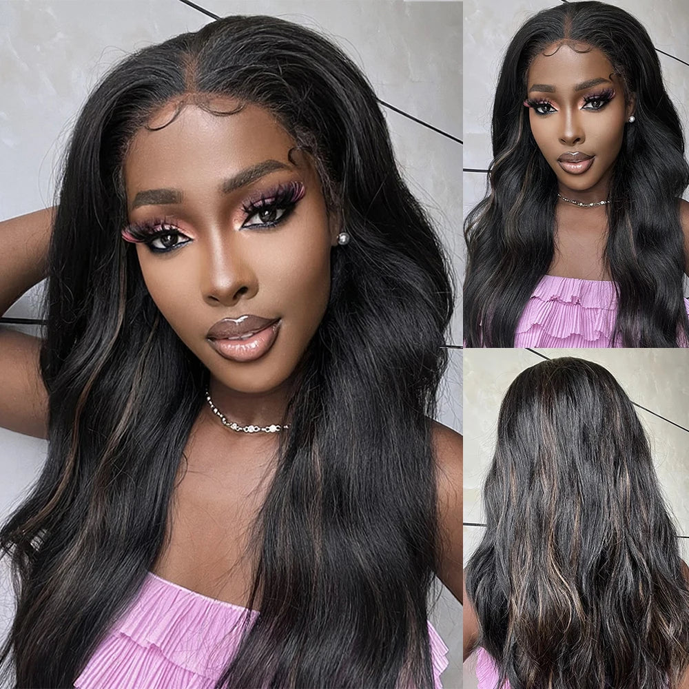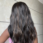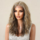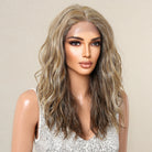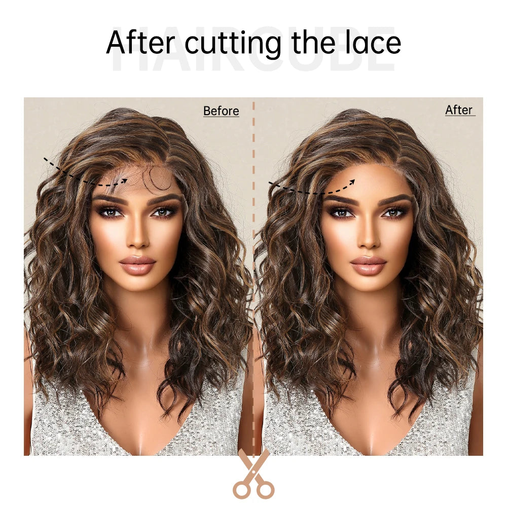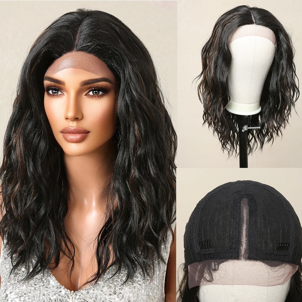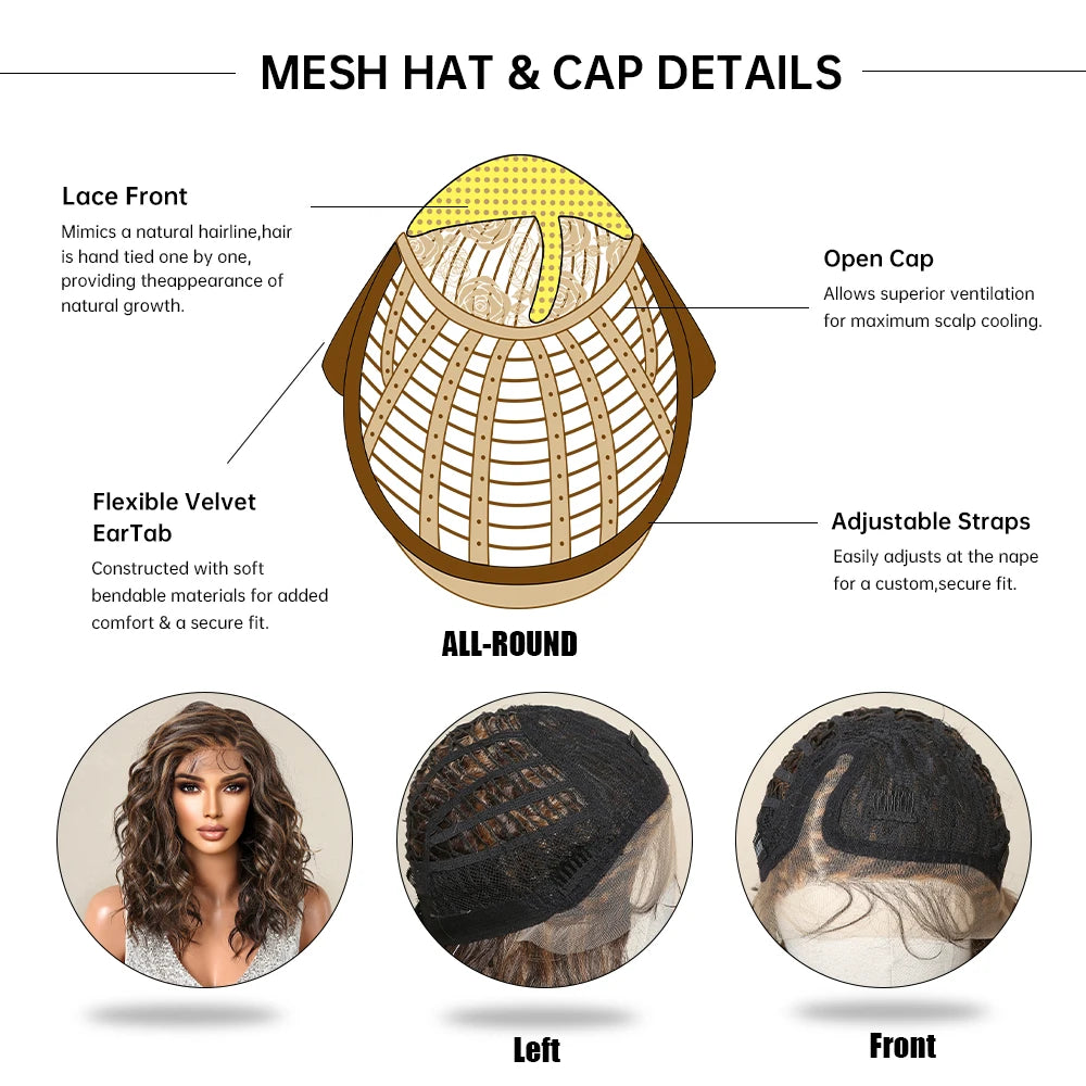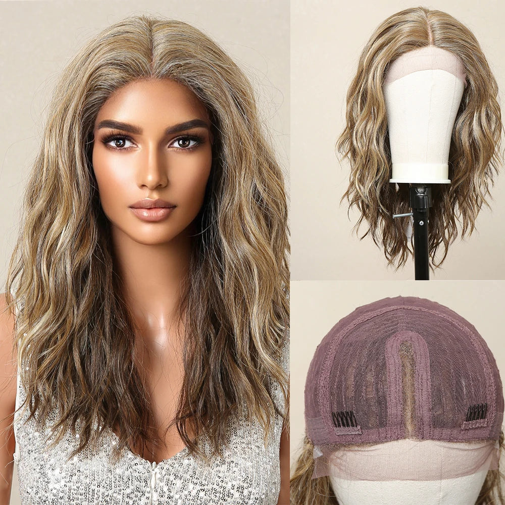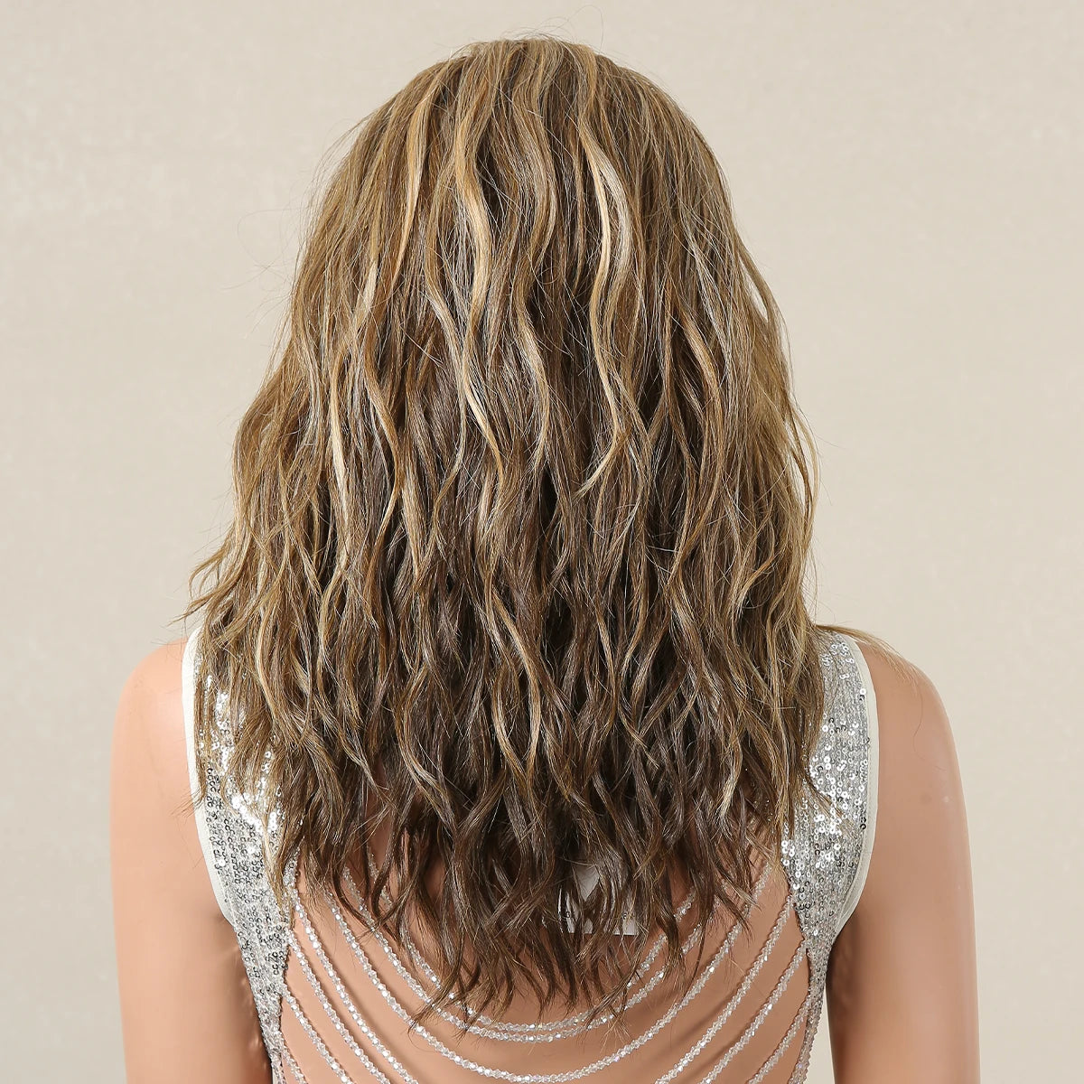 Elevate your style with this shoulder-length lace front wig—pre-plucked for a natural hairline, featuring curly waves in brown with golden highlights!