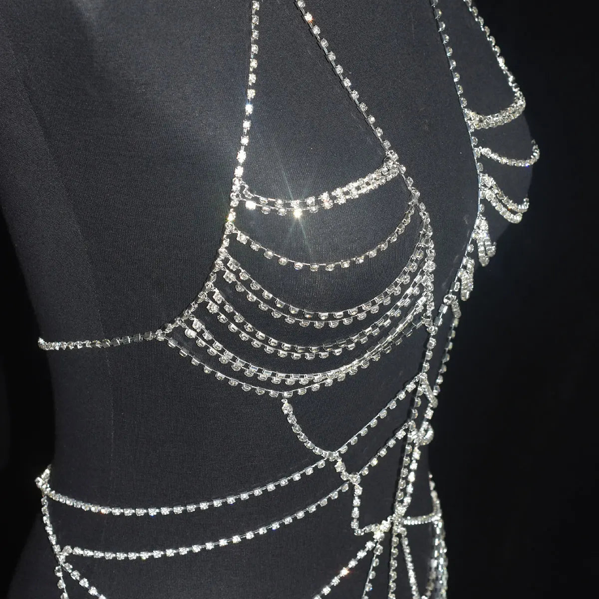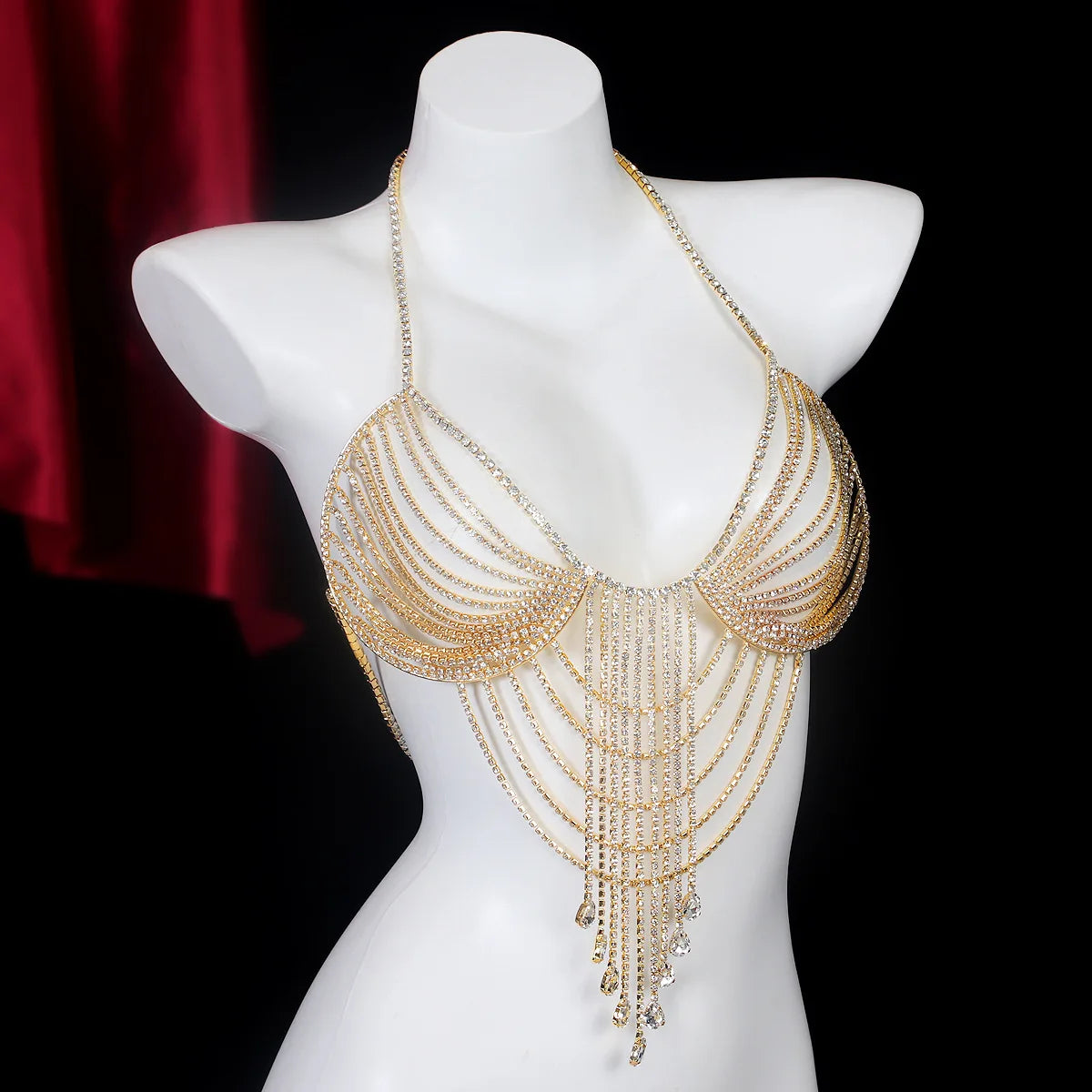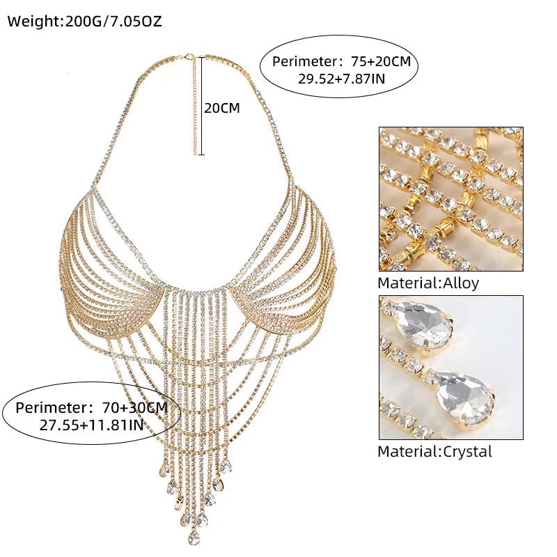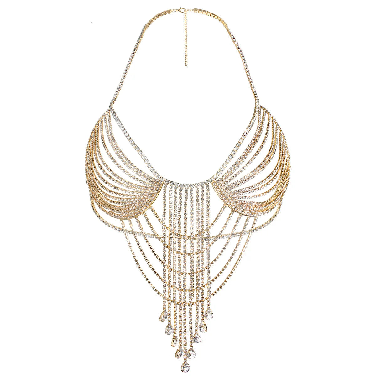 Light Luxury Multilayer Hollow Out Water Droplet Tassels Rhinestone Chest Chain Nightclub Body Chain