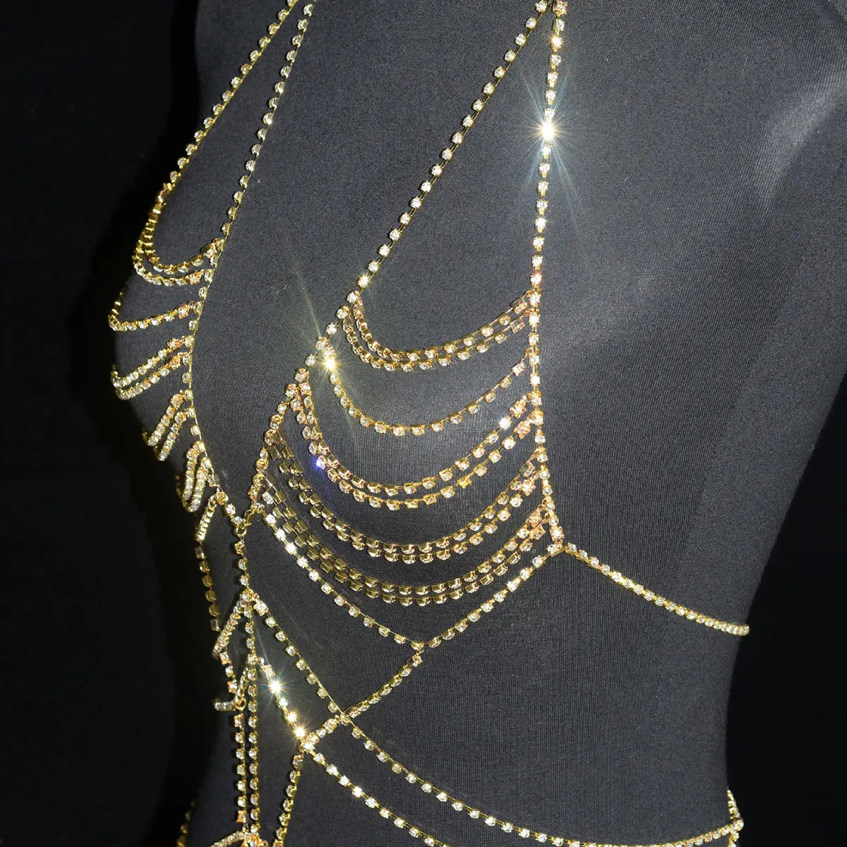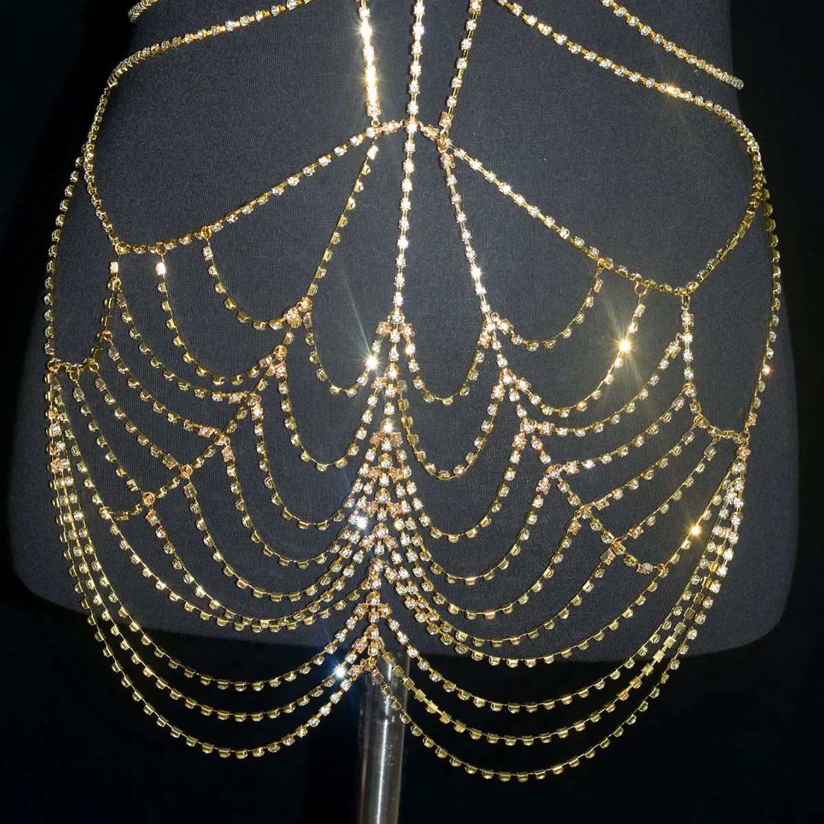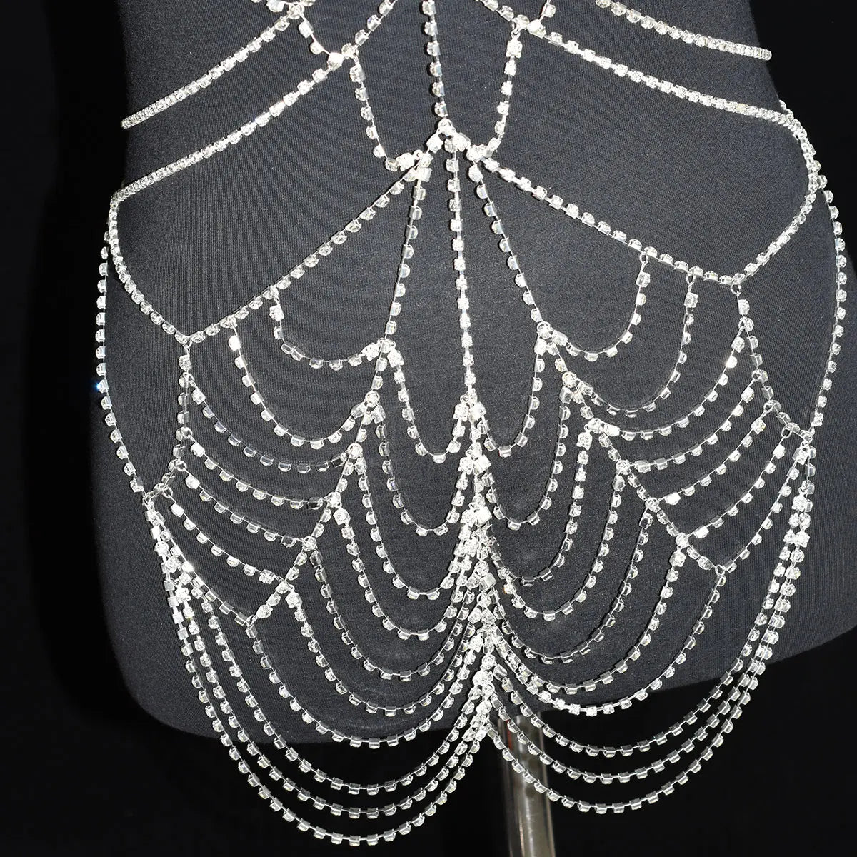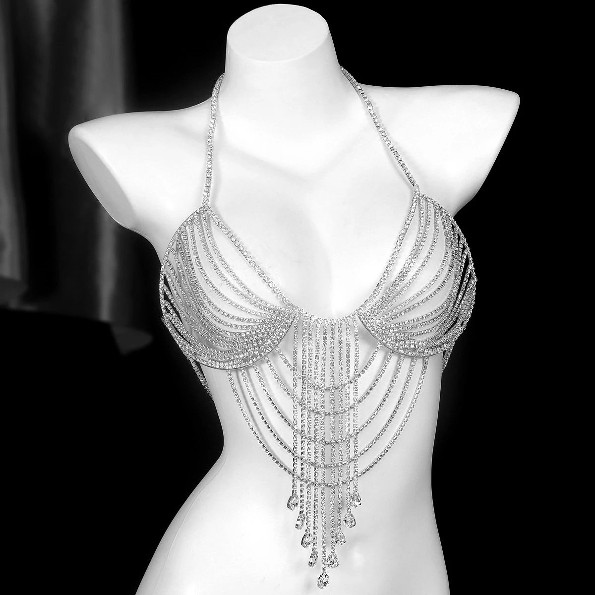Light Luxury Multilayer Hollow Out Water Droplet Tassels Rhinestone Chest Chain Nightclub Body Chain