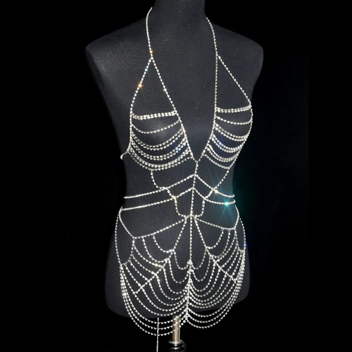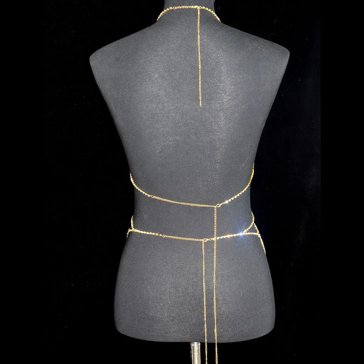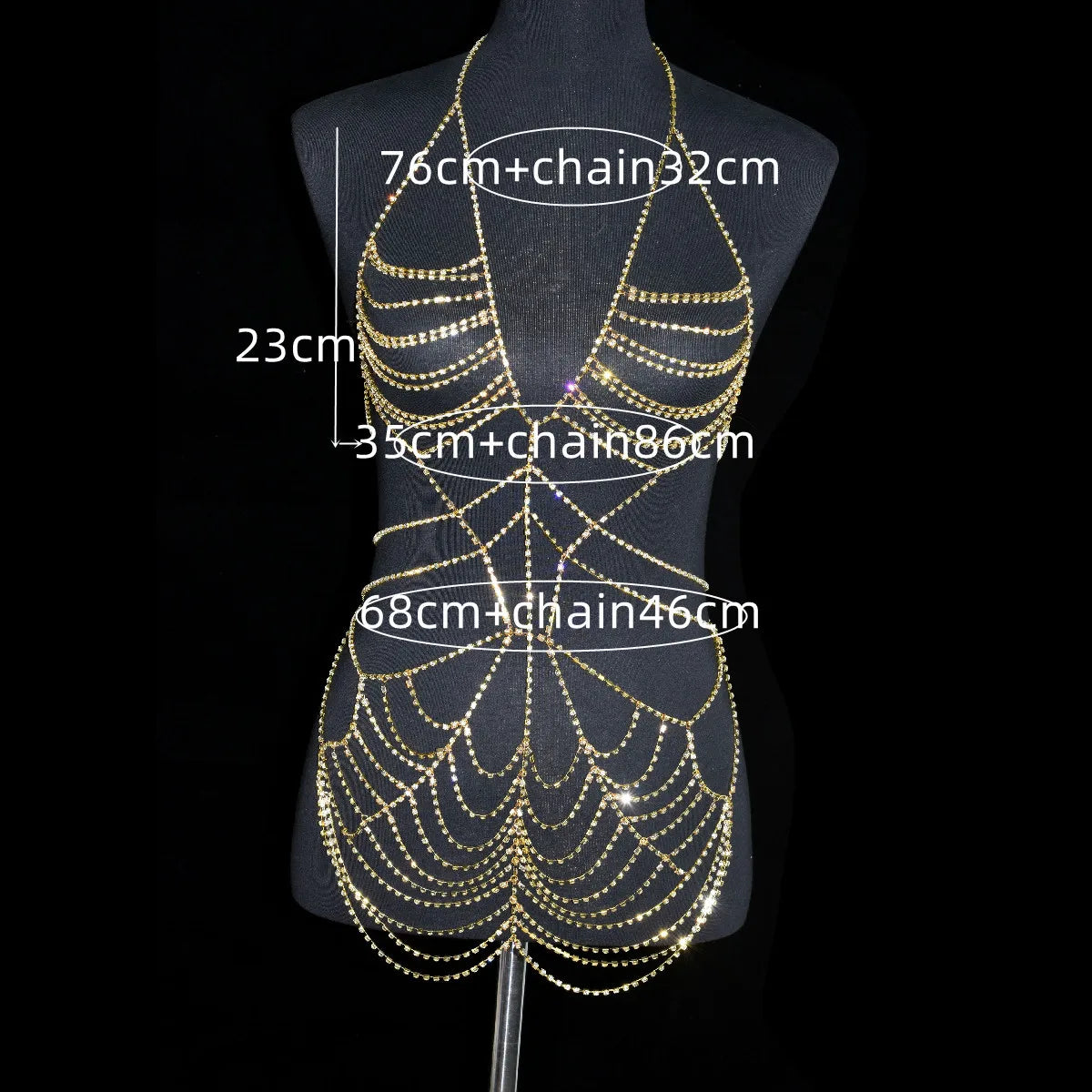 Sexy Metal Acrylic Body Bra Women's Chain Backless Harness Crystal Halter Dress Skirt Party Body Jewelry Festival Clothing