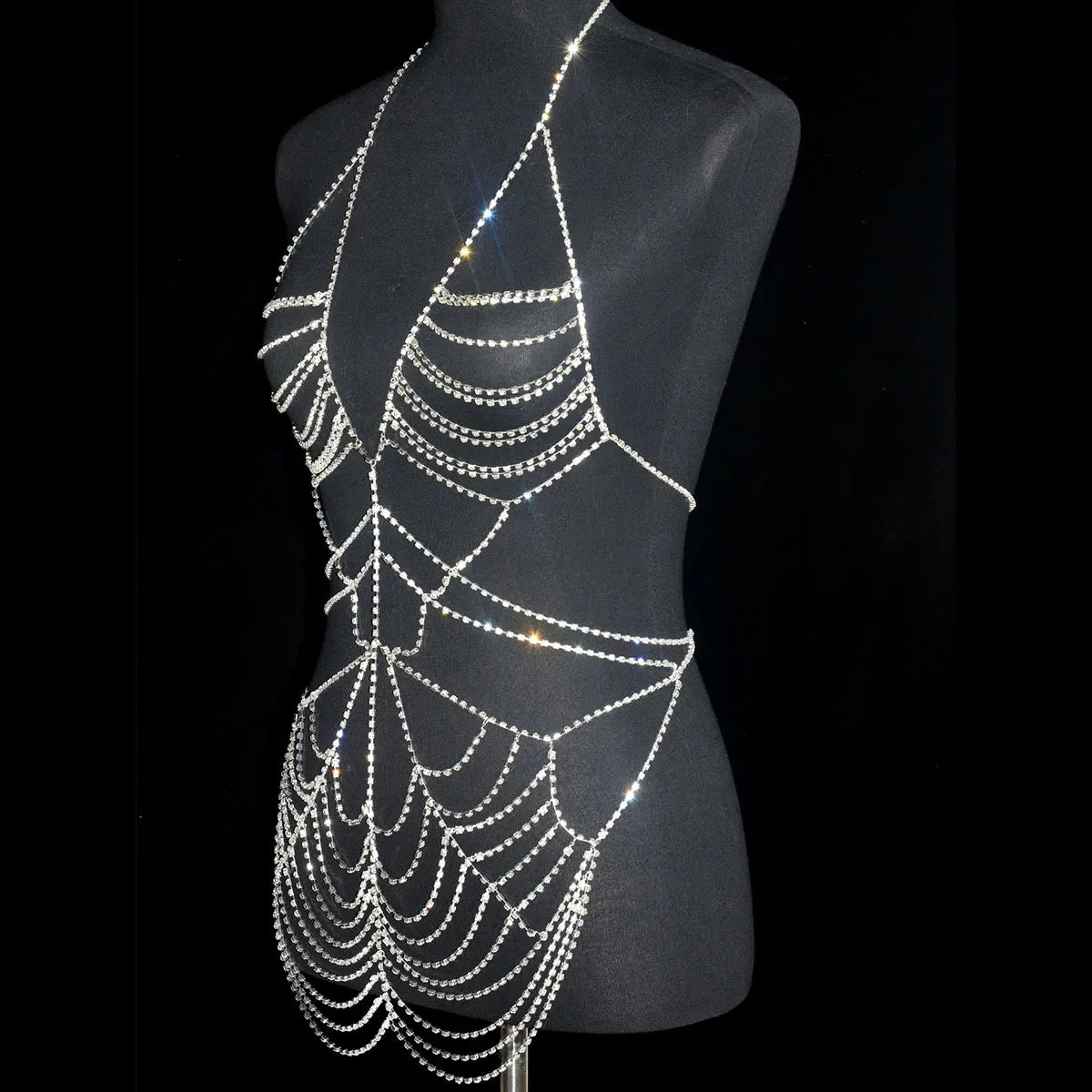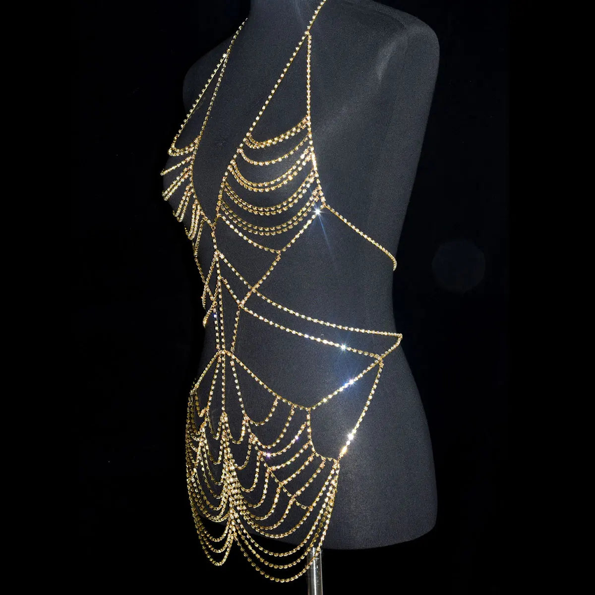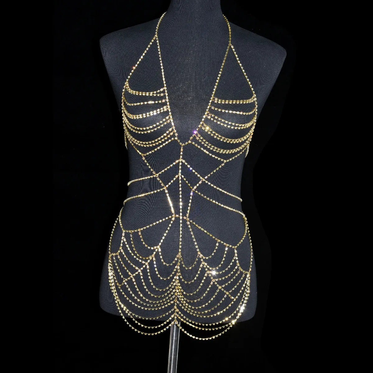 Sexy Metal Acrylic Body Bra Women's Chain Backless Harness Crystal Halter Dress Skirt Party Body Jewelry Festival Clothing