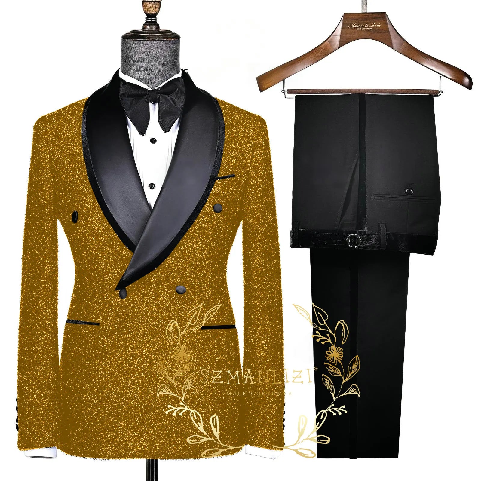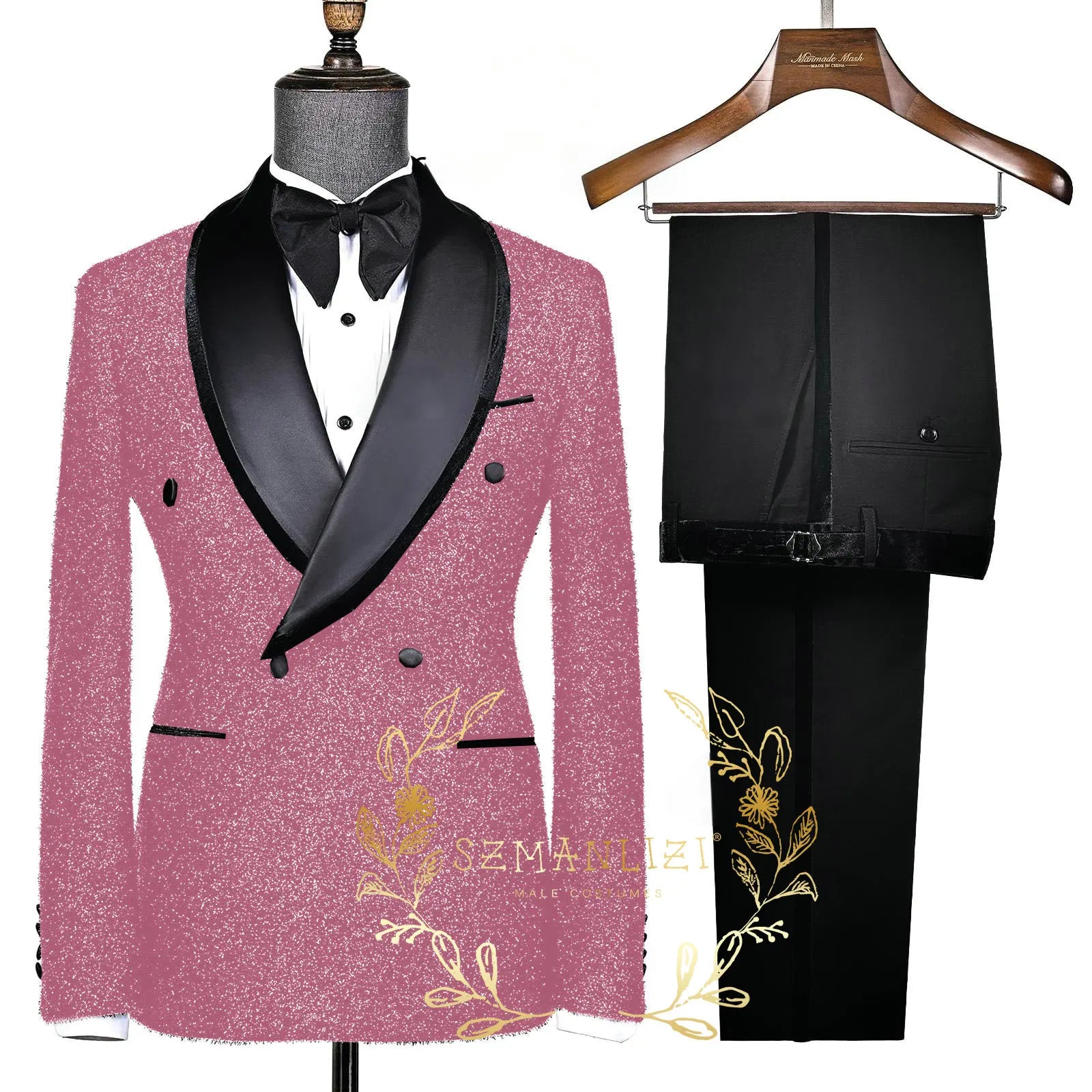 Fashion Shiny Black Men's Suits Slim Fit Double Breasted Shawl Lapel 2 Piece Jacket Pants Male Clothing Prom Party Outfits