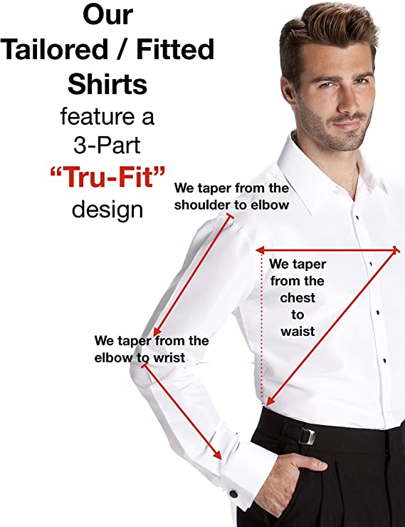 - Formal Shirts Fitted Style Vince - 100% Luxe Microfiber Dress Shirt or Formal Shirt features a 3-Part "Tru-Fit" design, tapered from the chest to the waist, from the shoulder to the elbow, and from the elbow to the wrist - Giving you the perfect fit - Sizes range from XS thru 3XL with sleeve lengths ranging from 30-31 thru 40-41