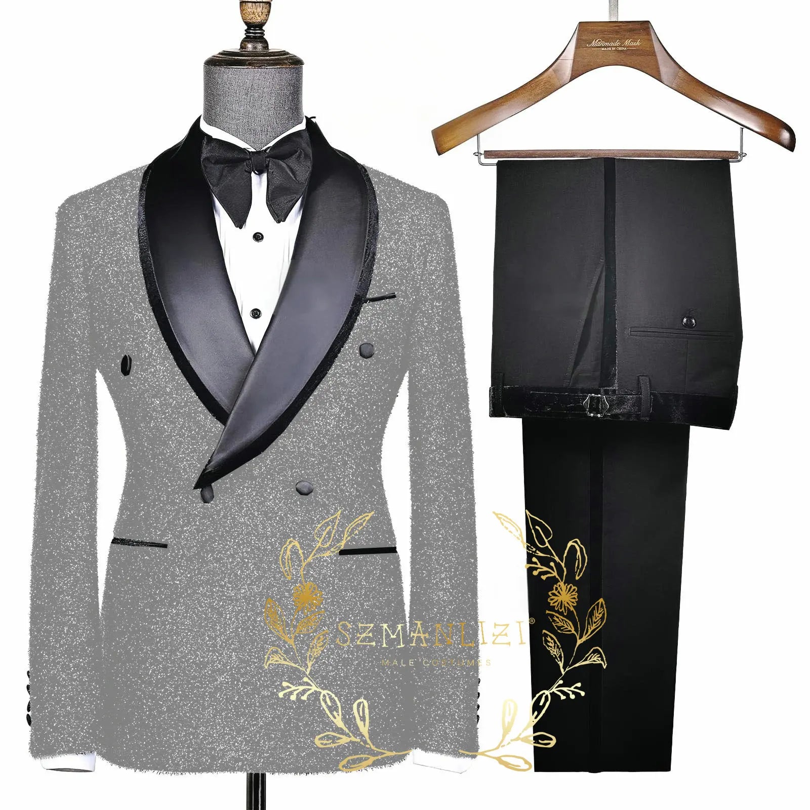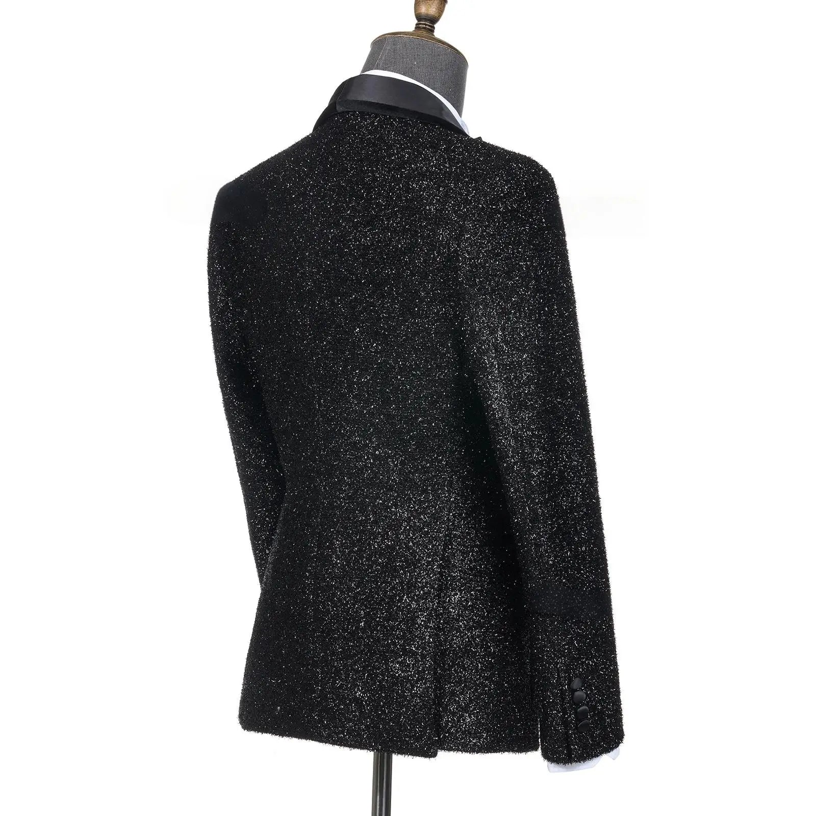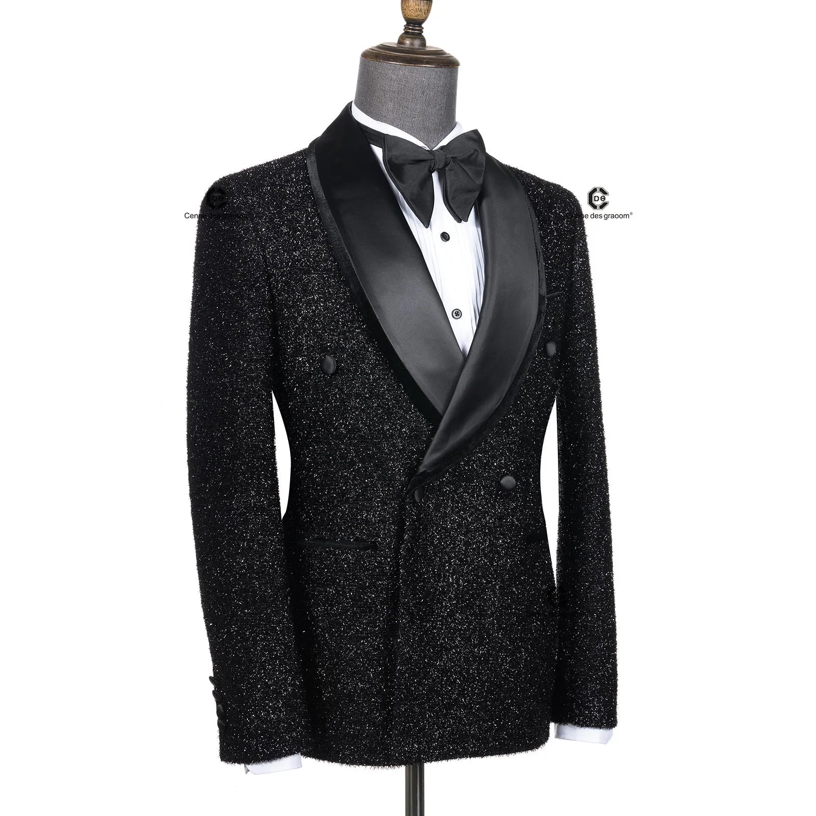 Fashion Shiny Black Men's Suits Slim Fit Double Breasted Shawl Lapel 2 Piece Jacket Pants Male Clothing Prom Party Outfits