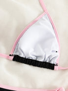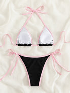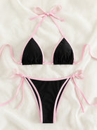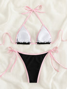 Contrast Trim Tie Side 2 Piece Bikini Swimsuit, Triangle Halter Tie Back Neck Stretchy Beachwear, Cute & Sexy, Women's Swimwear & Clothing