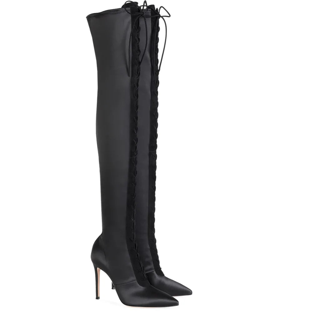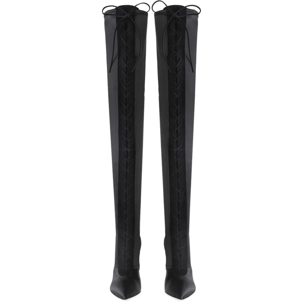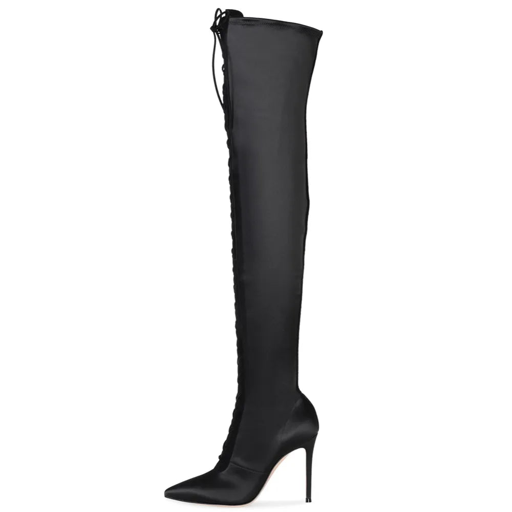 Big Size Women High Heel Thigh High Boots Ladies Heeled Winter Shoes Pointed Toe Lace up Black Satin Over the Knee High Boots