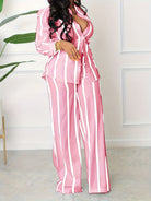 [Two-piece Set Long Sleeve Shirt] Striped Print Two-piece Set, Button Front Collar Long Sleeve Shirt & High Waist Wide Leg Loose Pants Set, Women's Clothing
